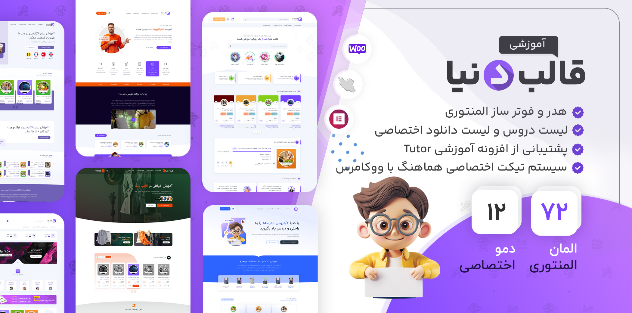 قالب آموزشی دنیا یک انتخاب قدرتمند برای افرادی است که میخواهند یک پلتفرم آموزش آنلاین استاندارد و کاملاً حرفهای ایجاد کنند. این قالب با ساختار ماژولار، طراحی مدرن و امکانات تخصصی حوزه آموزش، به شما امکان میدهد دورهها، اساتید، برنامههای یادگیری و محتوای آموزشی را بهصورت منظم و جذاب ارائه کنید. رابط کاربری قالب طوری طراحی شده که دانشجو بدون سردرگمی محتوای موردنظرش را پیدا کند، و استاد نیز مدیریت دورهها را با کمترین زمان و پیچیدگی انجام دهد. دنیا بهصورت کامل با نیازهای پلتفرمهای آموزشی ایرانی سازگار است و یک تجربه یادگیری روان و قابل اعتماد را تضمین میکند.